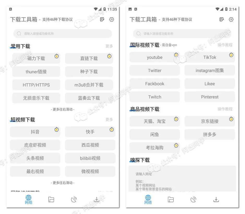 相比 iOS,安卓端的下载工具可就太多了,甚至某些APP通过修改后直接就能保存无水印视频,不过阿虚这里还是介绍几款支持平台更全面的通用下载器