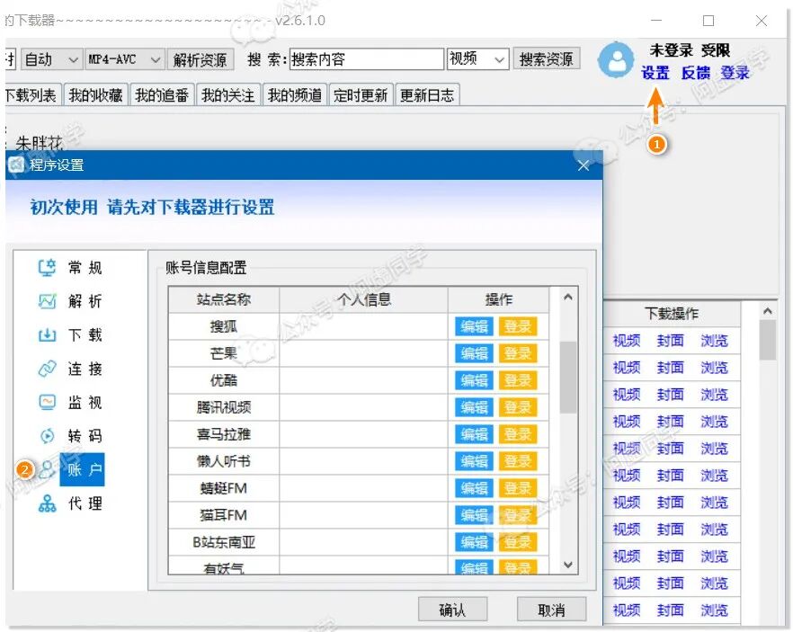如果你想借助软件下载某个会员视频,需要点击软件设置 » 账户,登录对应平台的会员账号