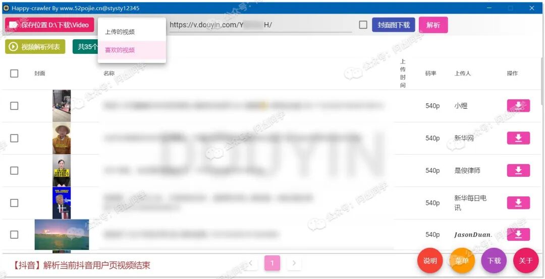 如果你想批量下载你的所有抖音喜欢的视频,可以借助吾爱破解论坛@stysty 开发的这款原创软件