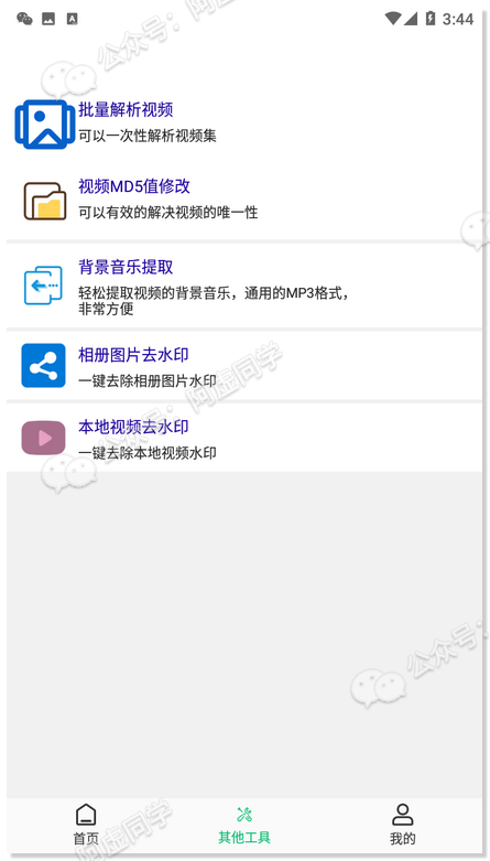 APP还有有一大优势是支持**批量解析下载无水印视频!**其他工具里还可以进行视频MD5值修改/视频音乐提取/本地图片去水印/本地视频去水印操作