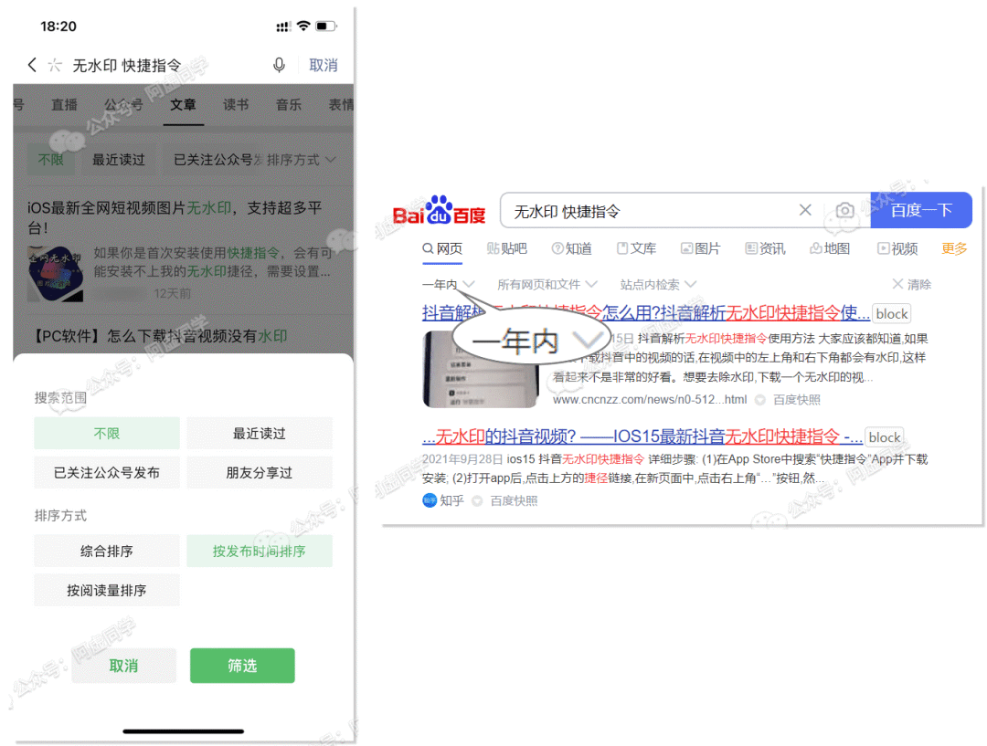 在微信、百度等地方,搜索「无水印 快捷指令」这类关键词,并筛选最新、最近的搜索结果,很容易就能找到最新可用的快捷指令