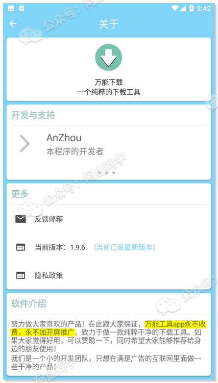 并且作者还有在软件内声明:APP永不收费+永不加开屏推广!就是想在满是广告的互联网里做一些干净的产品